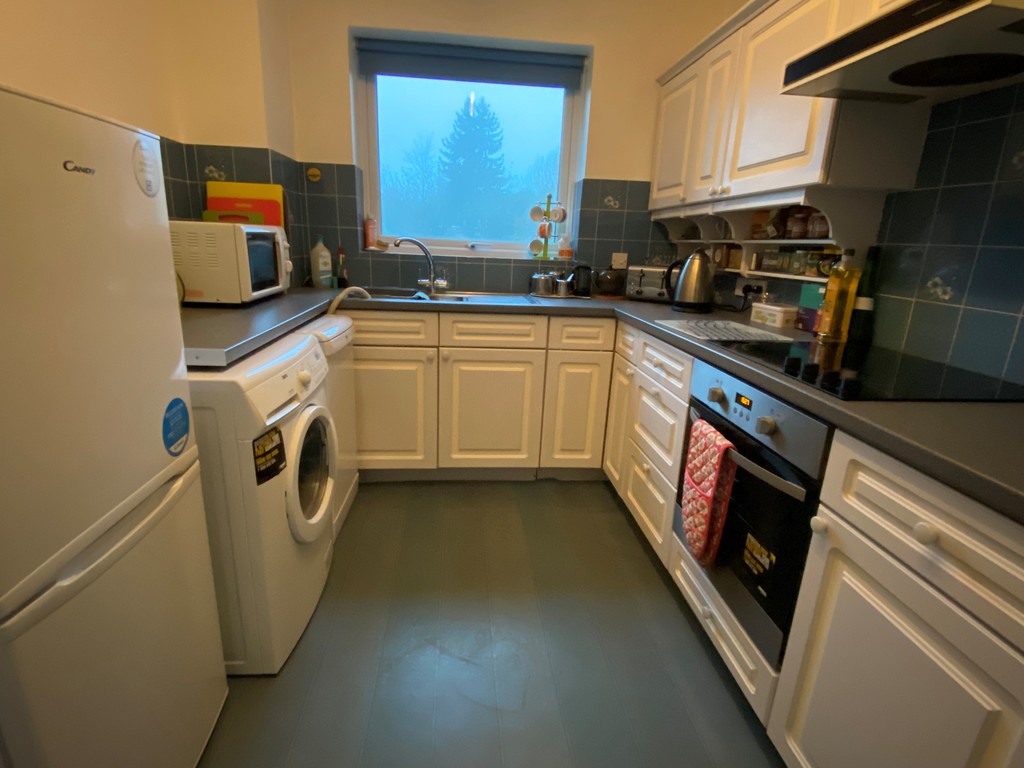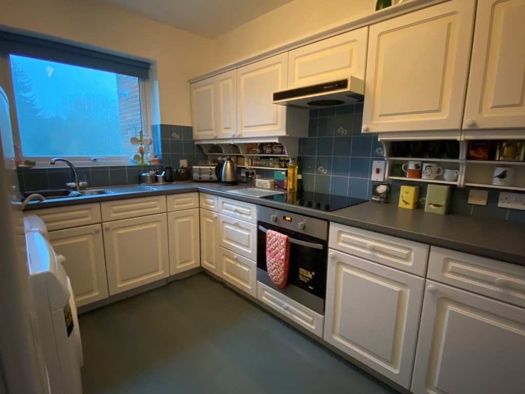 Inset Blanco single drainer stainless steel sink unit with mixer tap, range of matching wall units with concealed lighting and racking under and base units with work surfaces, inset 4 x ring Zanussi electric hob, built in oven and extractor hood over, plumbing for washing machine, space for slim line dishwasher, space for fridge freezer, part tiled walls, double glazed window overlooking main communal lawn.