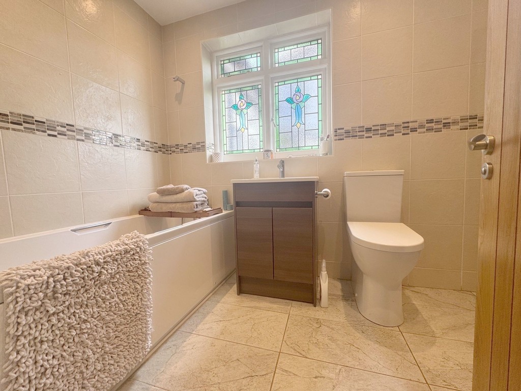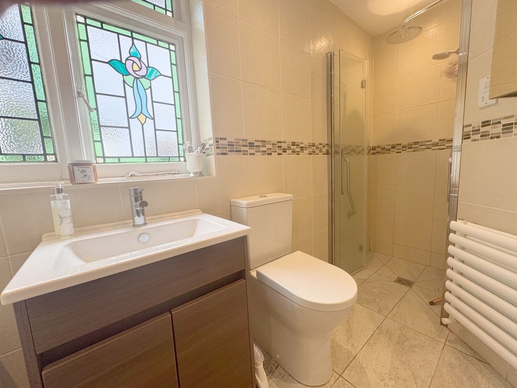 BATHROOM Suite comprising panelled bath with twin grip and mixer tap and shower attachment. Independent shower cubicle with glazed door. Independent shower with rainfall attachment. Vanity wash hand basin with mixer tap and storage below and low flush w/c. Contemporary style fully tiled walls and tiled floor. Original stained glass window to side. Extractor fan. Inset ceiling spot lights. Shaver point